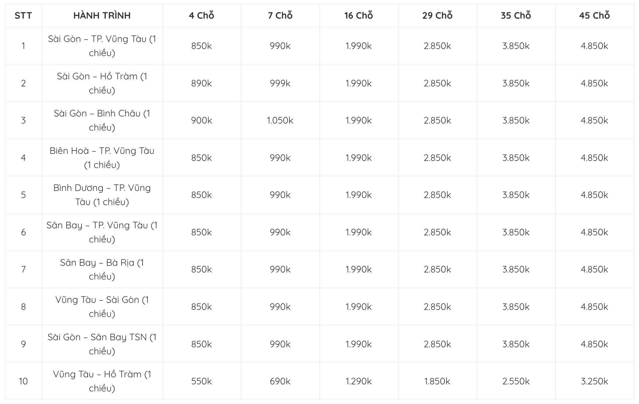 | 8 | Vũng Tàu – Sài Gòn (1 chiều) | 850k | 990k | 1.990k | 2.850k | 3.850k | 4.850k |